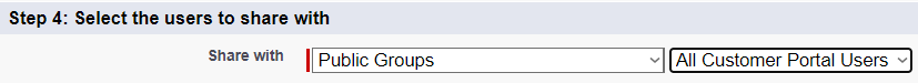 - “Public Groups”: you may select the standard group “Customer Portal Users”. Or you can create your own Public Group and use it here:
