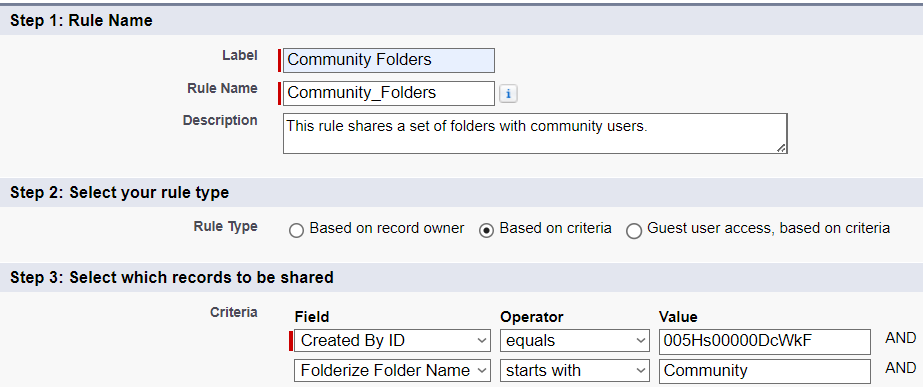 For example, a rule may select folders created by a specific system admin and having names which start with the phrase “Community – ”.
