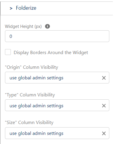 | “X” Column Visibility (where X is a column name) | Several columns in the table with documents support this setting. A setting has three possible values: 1. Use global admin settings: In this case the page uses the global setting for columns visibility that is configured on the “Folderize Admin” page. 2. Show: Ignore the global setting and force show the column. 3. Hide: Ignore the global setting and force hide the column. This setting is useful when you want to place the component in a narrow block. In this case you may decide to hide some columns in this place, but still show them in all others (if they are visible according to the global setting). |