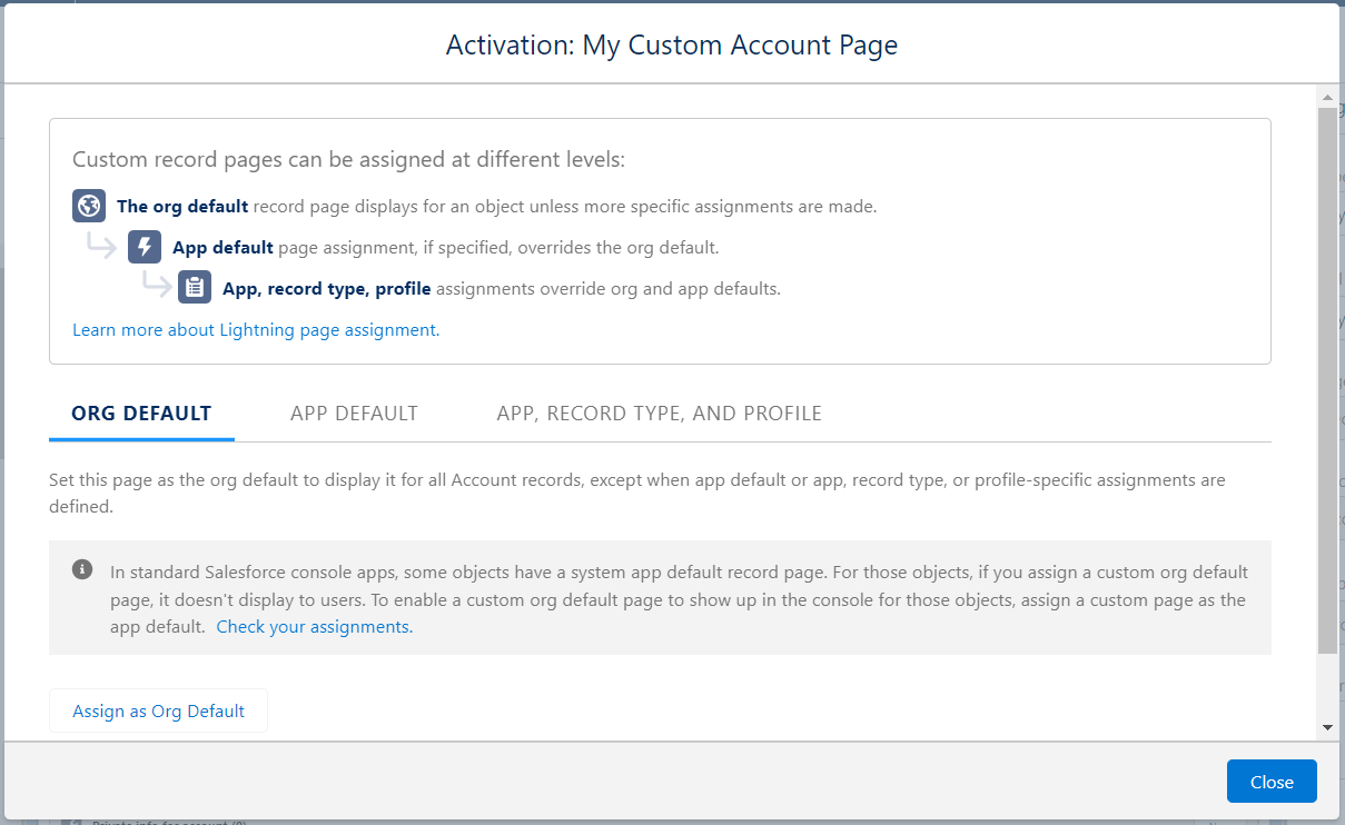 - “Org Default”: if you want to display this page for an object everywhere: